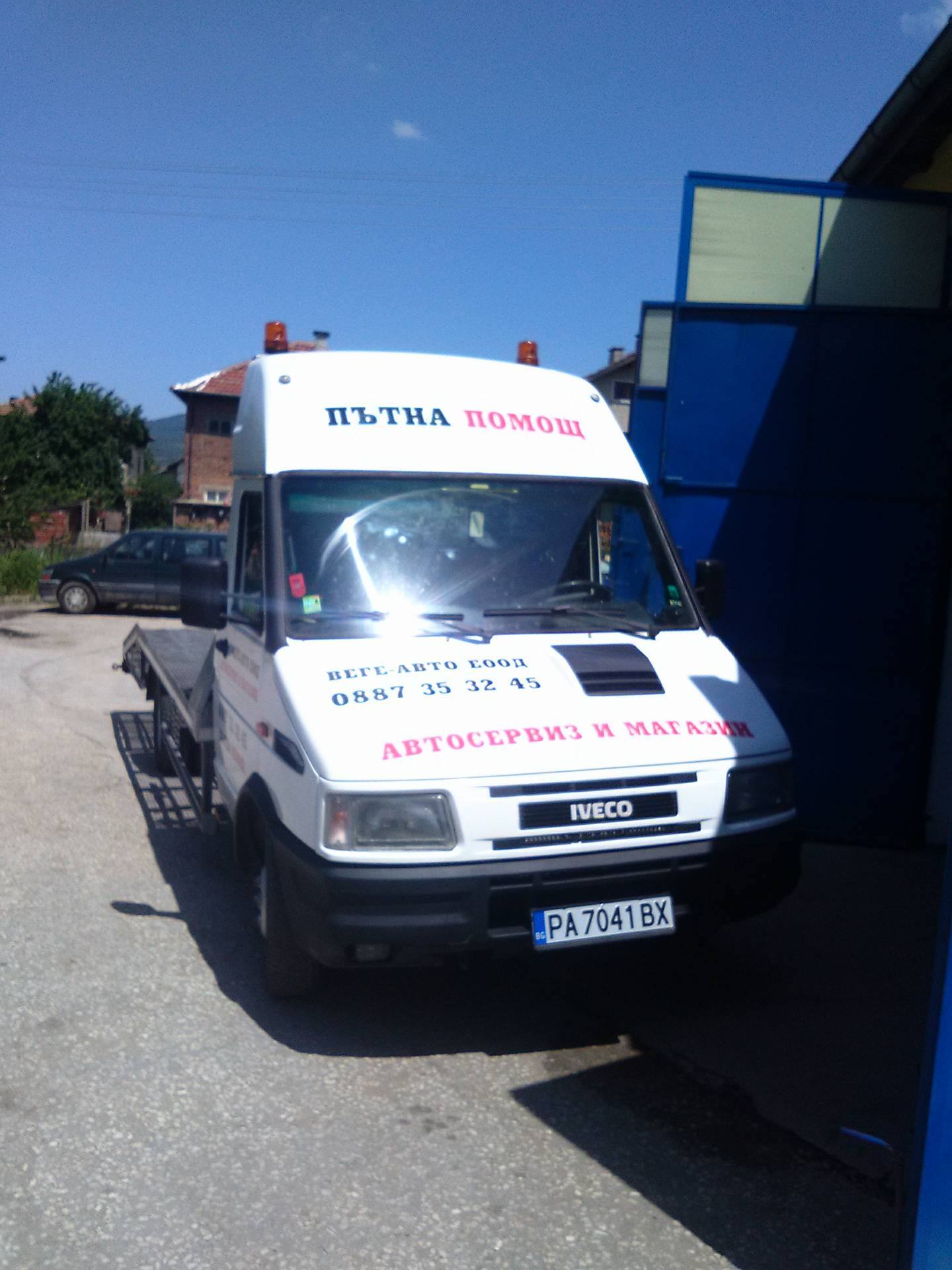 Професионална пътна помощ. Веге-Авто притежава напълно оборудван камион за превозване на аварирали превозни средства от всякакъв тип. Камионът е оборудван със стационарна и хидравлична платформа, както и лебедка с товароподемност до 7 тона.